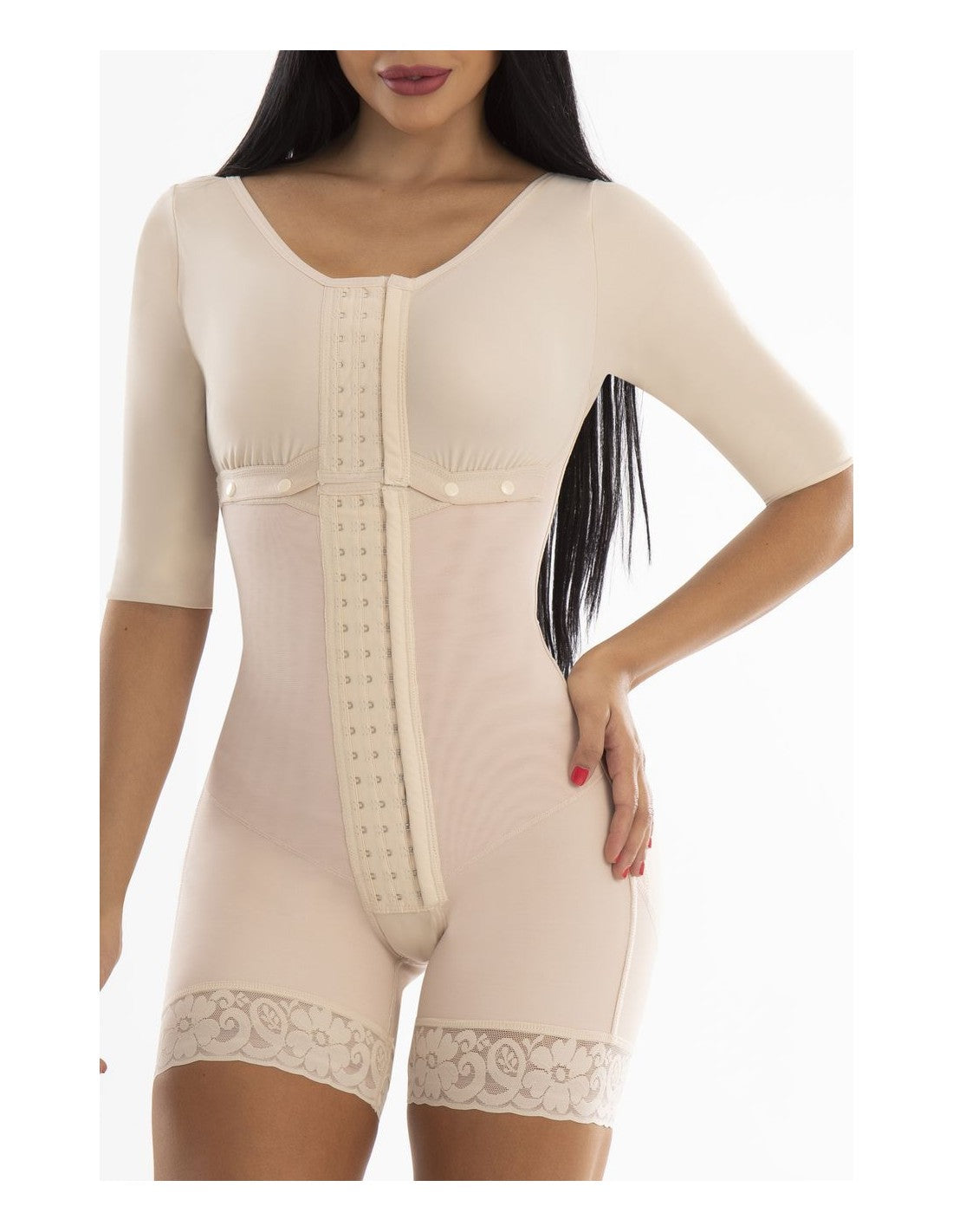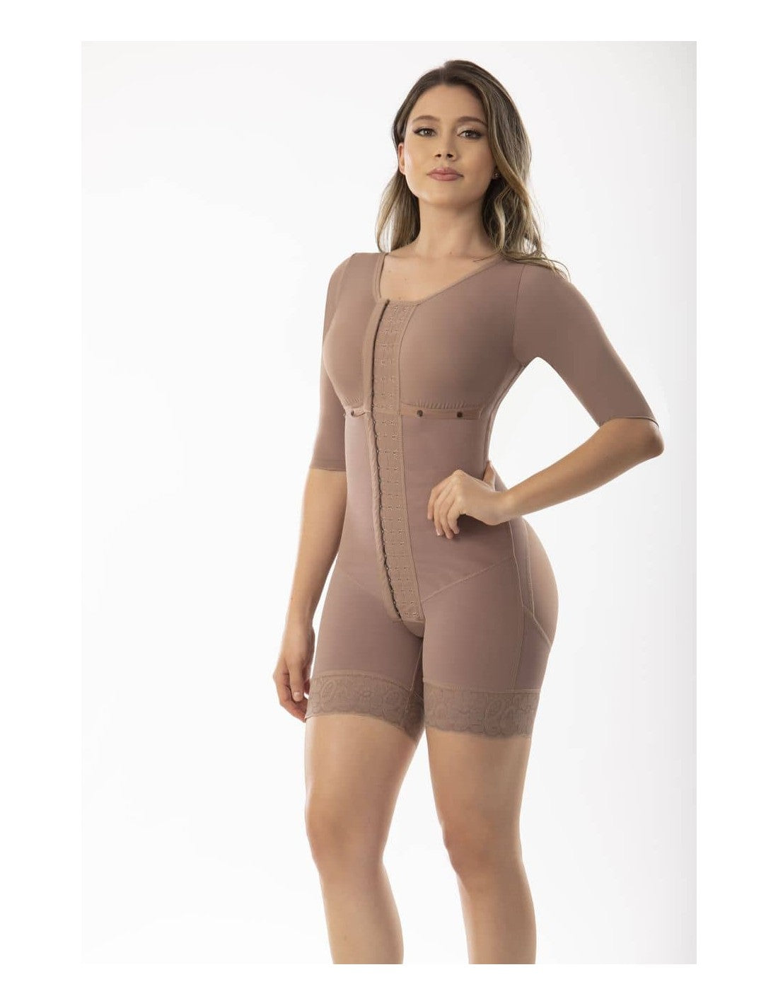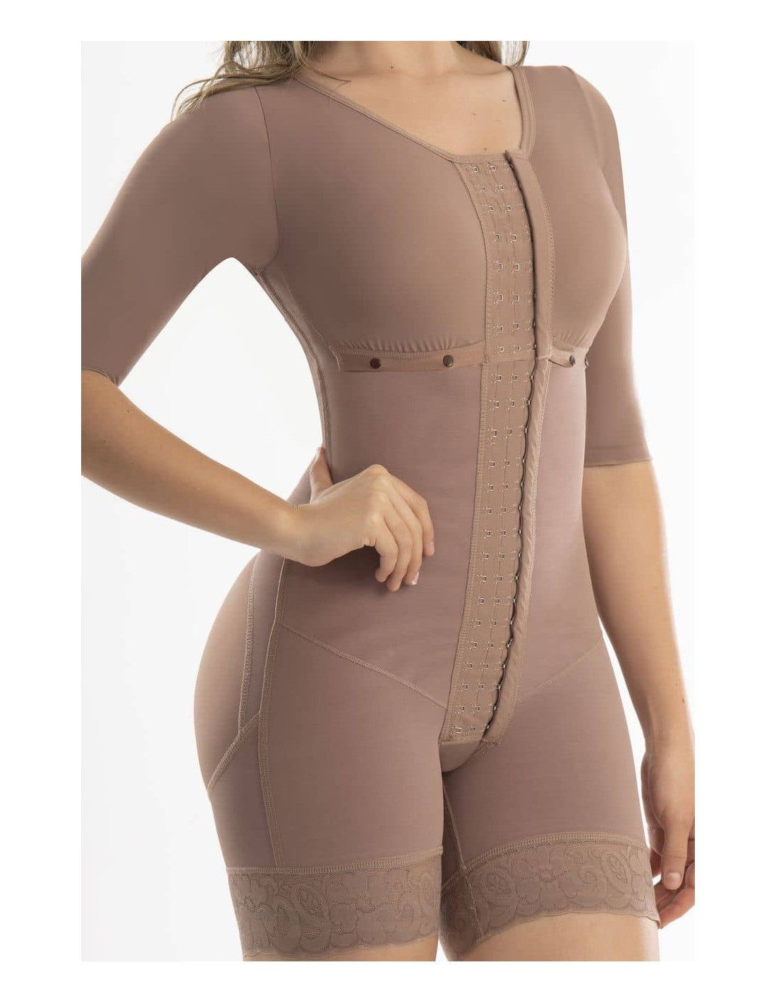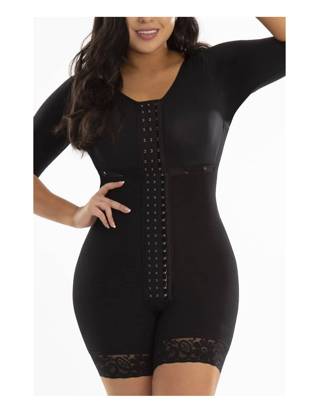 Gaine intégrale à manches, idéal pour une silhouette naturellement définie. Offrez un soutien femme au niveau de l'abdomen, des bras et du dos, tandis que son design lifting invisible met en valeur les fesses sans les marquer. Idéal pour un usage quotidien ou pour la récupération postopératoire, grâce à un réglage confortable, discret et sûr.